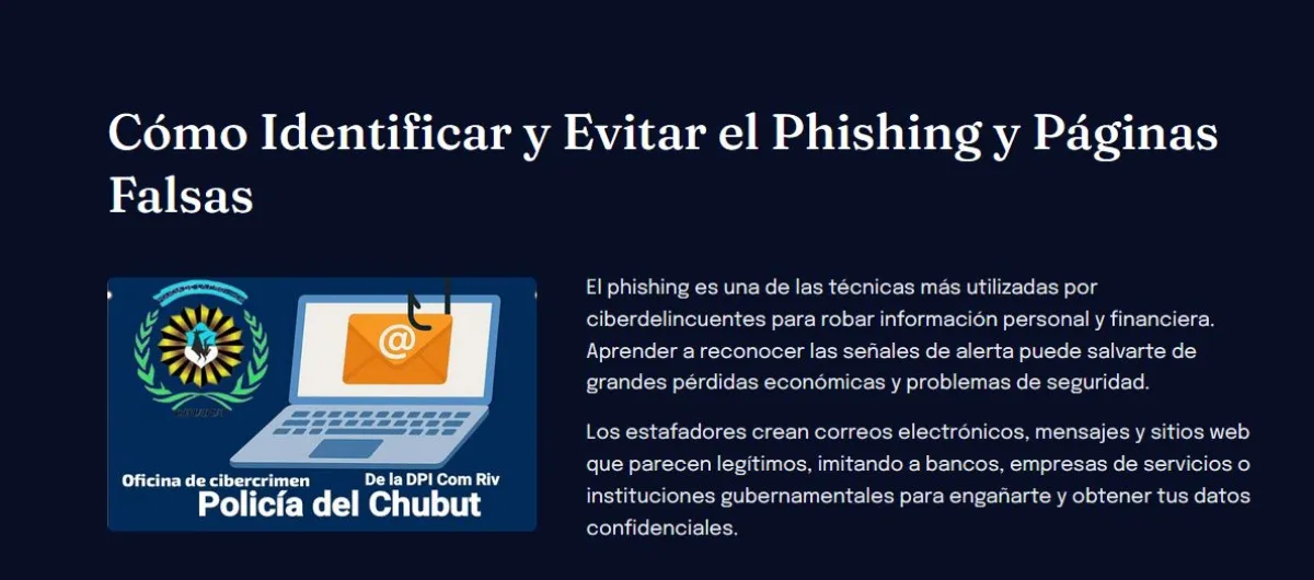 Desde hace tiempo la División Policial de Investigaciones (DPI) de Comodoro Rivadavia, advierte a vecinos sobre el tema de estafas virtuales. Cuentan con un equipo que se dedica justamente a trabajar sobre este tipo de delitos. Por ello, la División a cargo del subcomisario Javier Orellano y la subcomisario Daniela Millatruz, ya el año pasado, creo un canal de WhatsApp donde advierten sobre las modalidades que van surgiendo a la hora de delinquir.